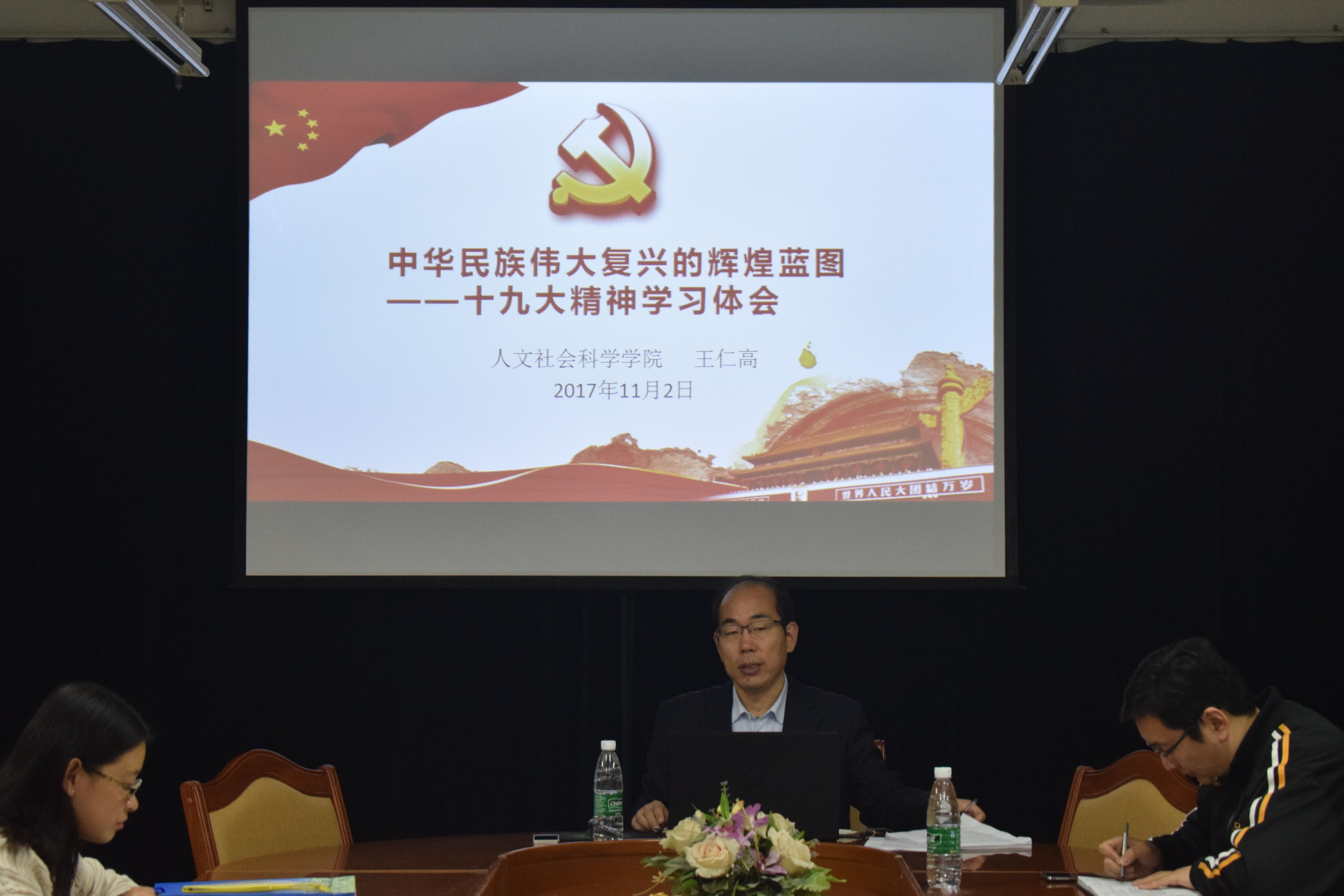 11月2日,太阳成集团tyc234cc党总支书记王仁高在文经楼C515上了一堂题为“中华民族伟大复兴的辉煌蓝图--十九大精神学习体会”的主题党课。团委书记李超主持,全体学生党员、党员发展对象和入党积极分子聆听了党课。