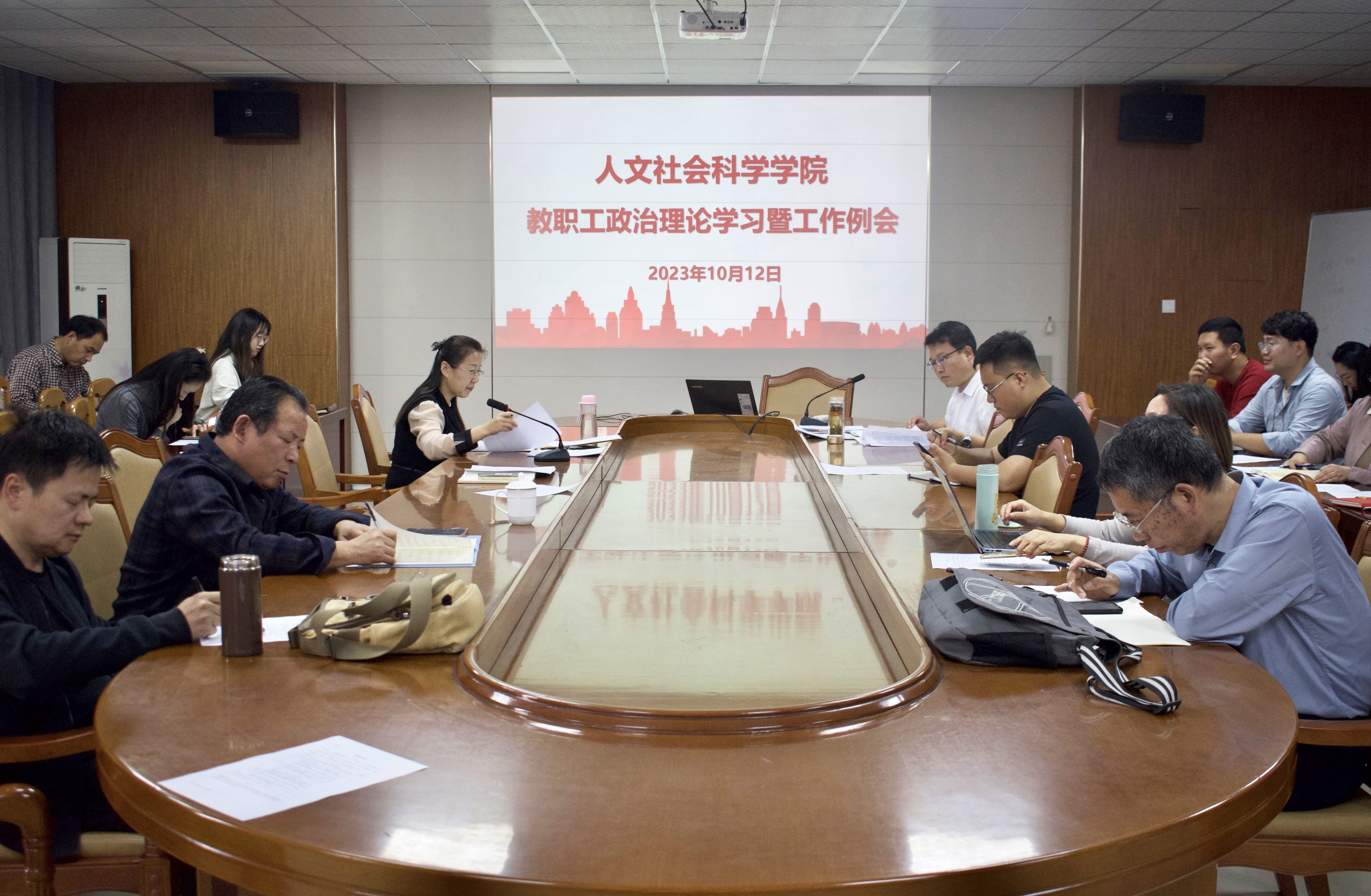 副院长蔡连卫传达部署了科研有关工作,院长助理张华强调了课程论文有关事宜。会上,学院还开展了教职工共听一堂课听课评课活动,对刘鹏老师的近代文学研究课程进行了观看与点评。