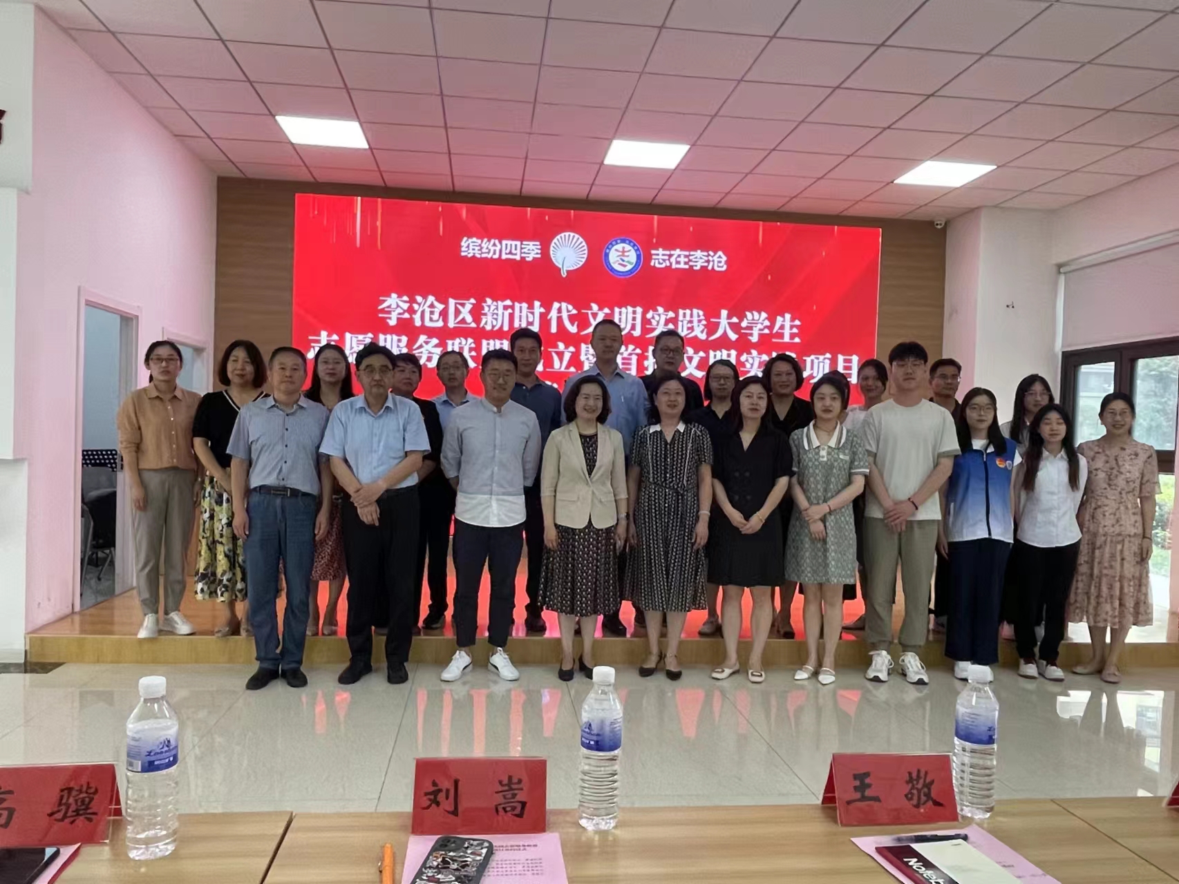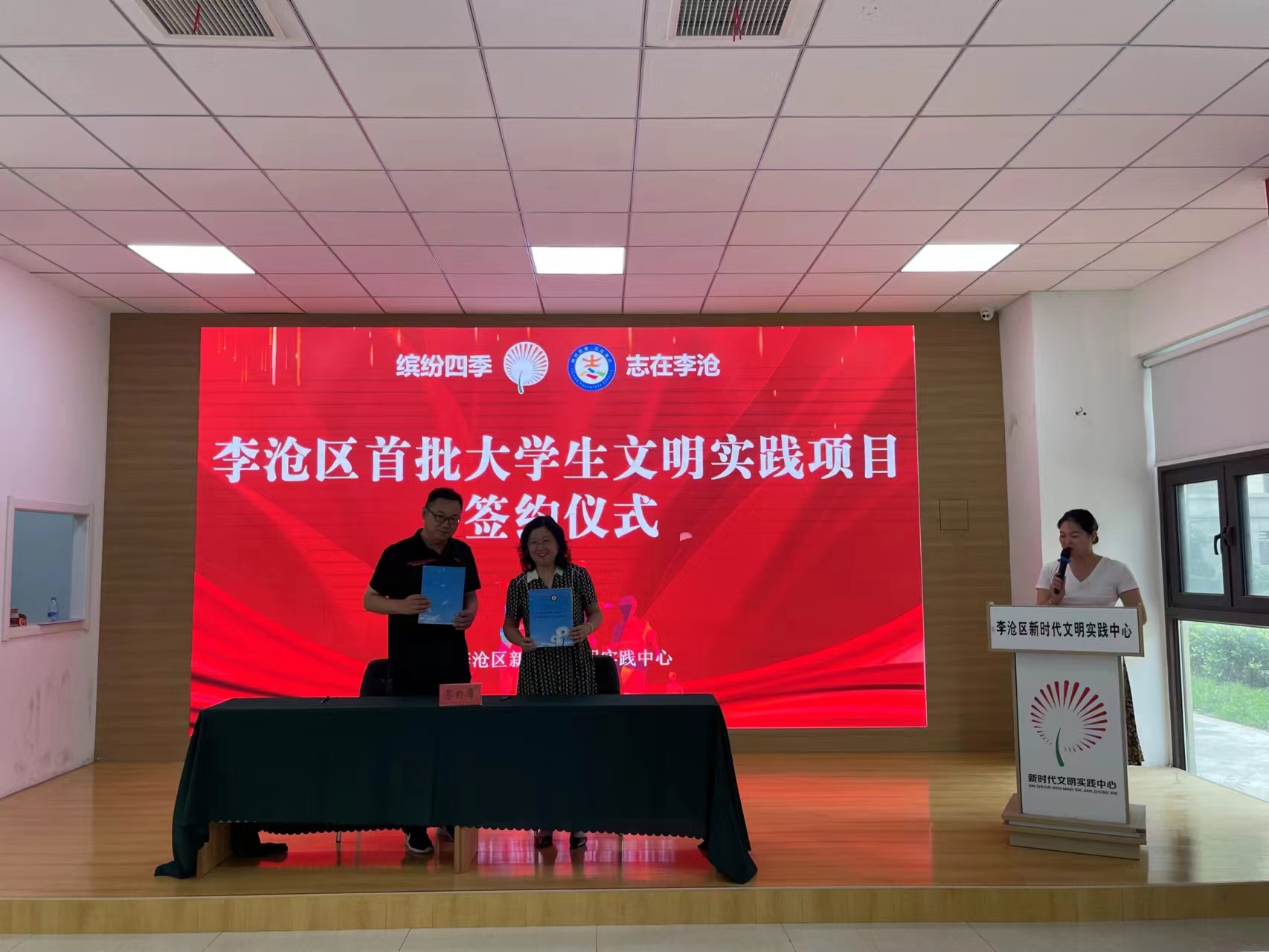 活动现场发布了首批大学生文明实践志愿服务项目。新时代文明实践大学生志愿服务联盟成员单位,分别与李沧区新时代文明实践中心,李村街道、虎山路街道、浮山路街道、沧口街道、九水街道、世园街道辖区的14个社区,签订了首批32个大学生文明实践志愿服务项目。王敬作为代表与李沧区新时代文明实践中心正式签订合约,学院“虹文·益”大学生志愿服务团将在未来持续参与到有关实践活动中。