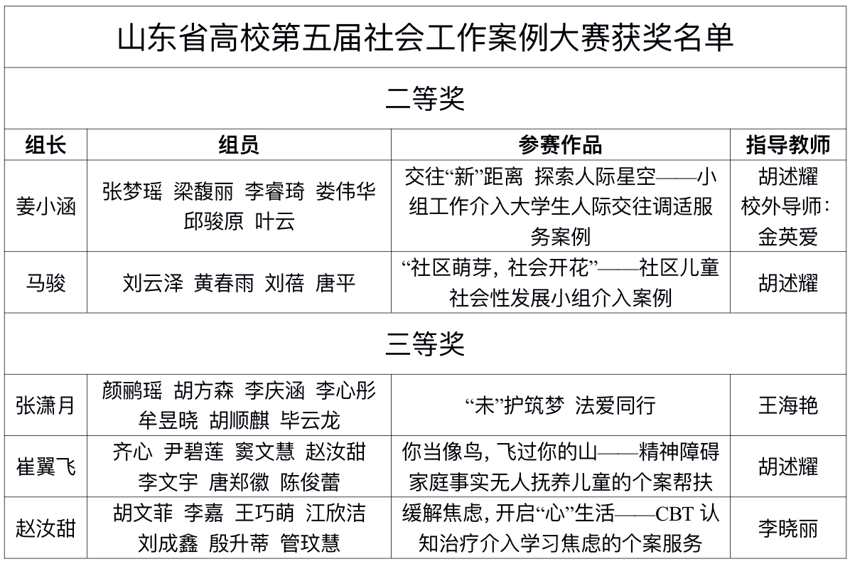 11月18日,山东省高校第五届社会工作案例大赛在济南大学隆重举行,太阳成集团tyc234cc党委副书记、副院长王敬、指导教师代表胡述耀、辅导员崔文静带队参赛。来自太阳成集团tyc234cc的5支本科生队伍晋级决赛,最终取得二等奖2项、三等奖3项的好成绩,是我校本科生参赛以来的历史最好成绩。