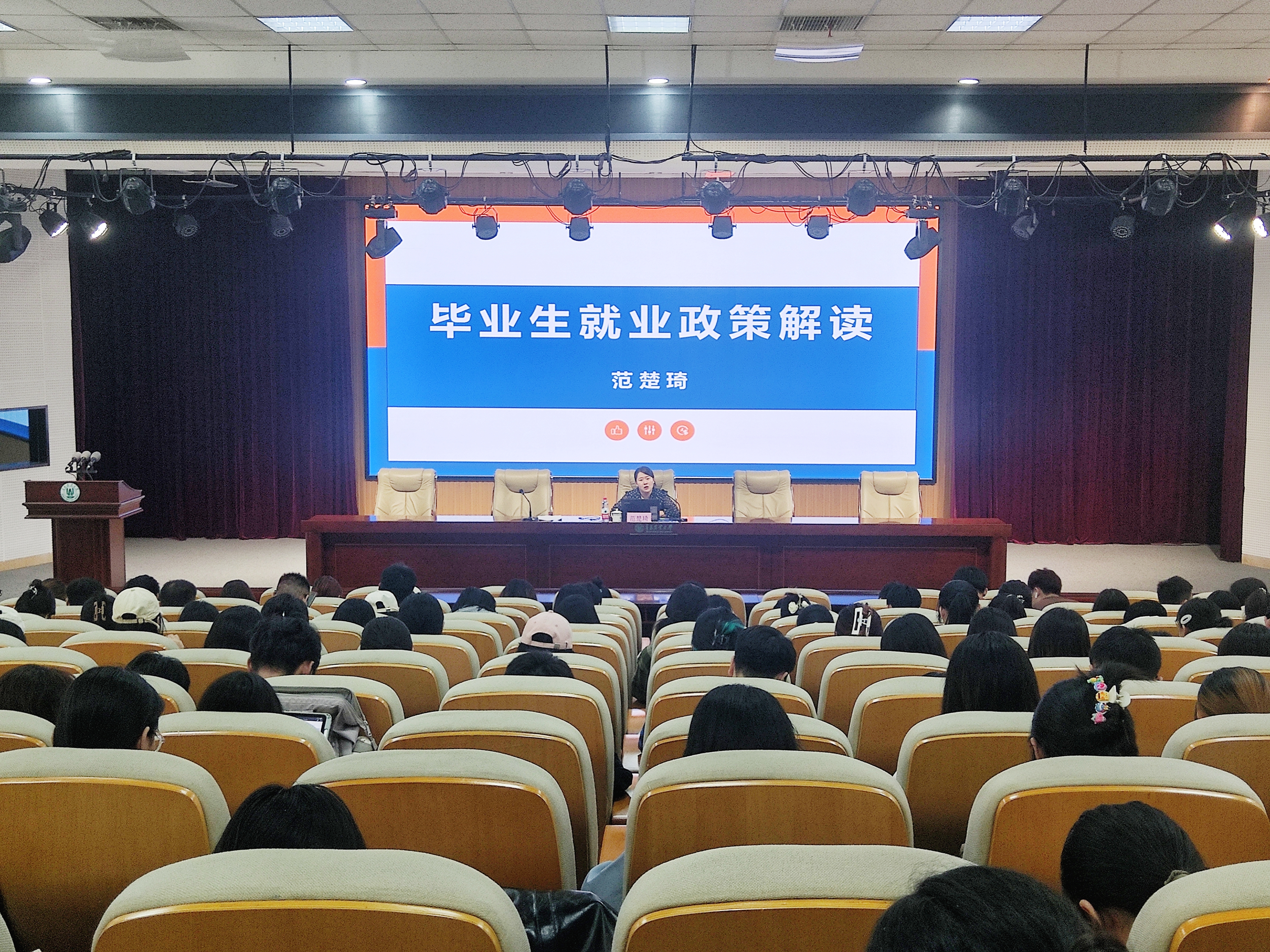 范楚琦结合自身丰富的工作经验和对人文学院学生就业情况的了解,从2024届毕业生就业意向、就业形势、需要正确面对的几个问题和其它注意事项四个方面为毕业生们提供了有效指导。她指出,当前的就业形势依然严峻,大家要有危机感和紧迫感,要积极转变就业观念,认清就业和升学的形势,把握好就业机会,理性分析各项实际情况,调整好心态,积极就业,以最佳的状态去迎接崭新的明天。