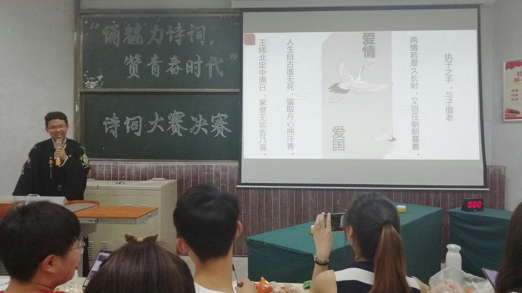 最激动人心的当属第三环节——飞花令,即参赛选手在规定时间内说出含有关键词的诗句。经过三轮的比拼,其他队伍节节败退,最终以“诗酒趁年华”队对战“扫眉才子”队将此次比赛推向高潮。才子对战才女,是“巾帼不让须眉”还是“少年意气壮虹霓”给比赛埋下了极大的悬念。两队长达三分钟的诗词车轮战最终以汉语言文学专业1802班的张泽辉同学吟诵的“待到秋来九月八,我花开后百花杀”结束,全场更是爆发出热烈的掌声,这既是对台上同学们精彩比赛的认可,也表达了台下同学们内心深深的敬佩。