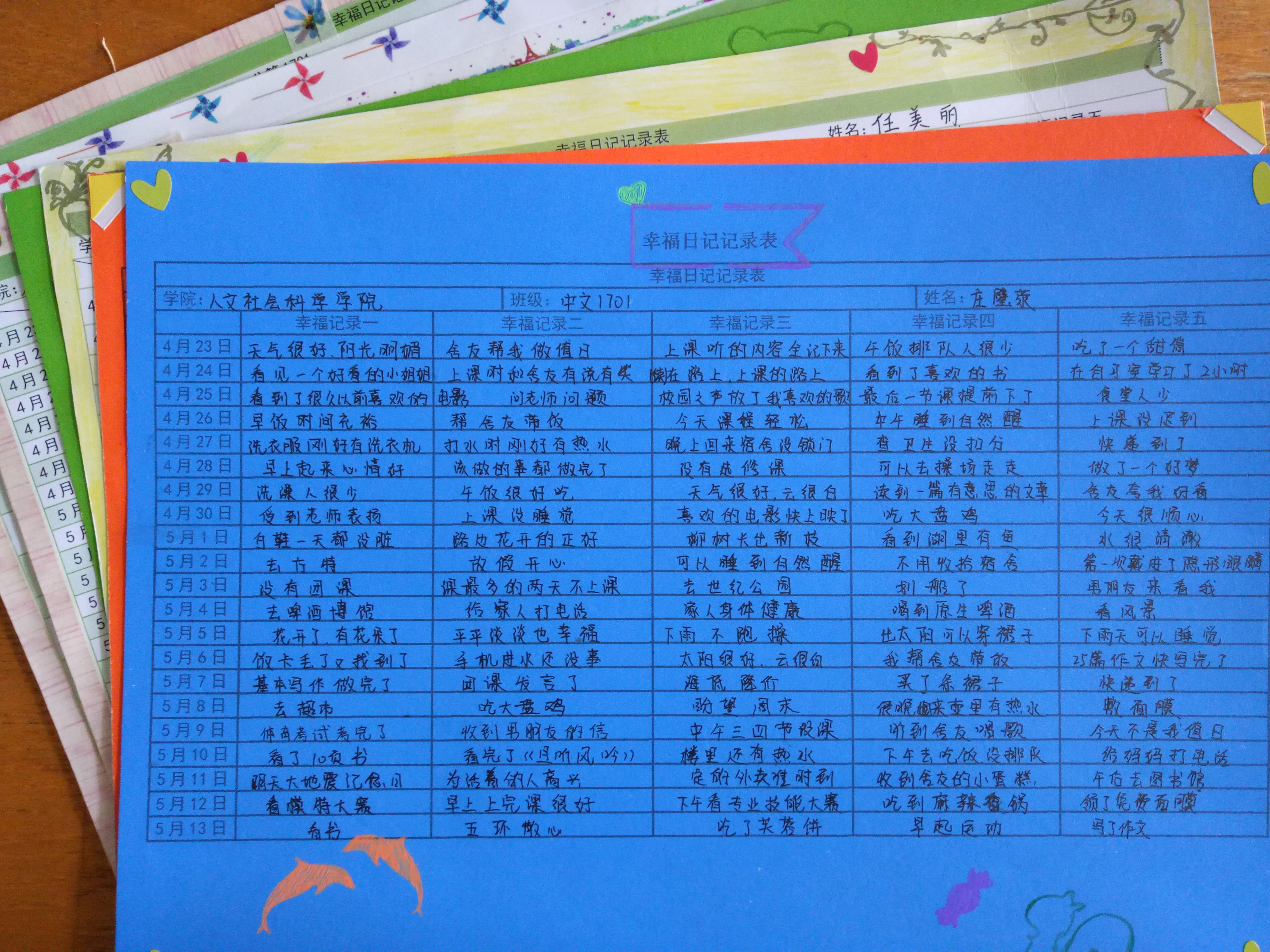 本次活动分为线上记录与线下幸福记录表和心得卡片填写两个环节。线上记录环节分为“幸福日记”、“日行一善”和“我要说声谢谢你”三部分。学院同学积极参与,每天在“幸福链接”中分别记录下令自己感到幸福的三件事物和自己做过的一件“利他”的事情,比如“今天天气很晴朗”、“今天课堂笔记记得很认真”、“今天我在公交车上为老人让座”等。在线上记录环节结束后,同学们积极填写心得卡片,写下自己参与活动的感受。公共事业管理1601班张晓敏同学写道:“通过参与幸福记录活动,让我明白幸福其实就在我们身边,需要我们用心去感受”。汉语言文学1701班王婷婷同学则写道:“生活中应常怀感恩之心,感恩是一种情感,更是一种责任”。最后,我院蒙冠妙、任美丽、朱英豪、卢晓珊、庄壁荥五位同学荣获“幸福日记”优秀个人奖。