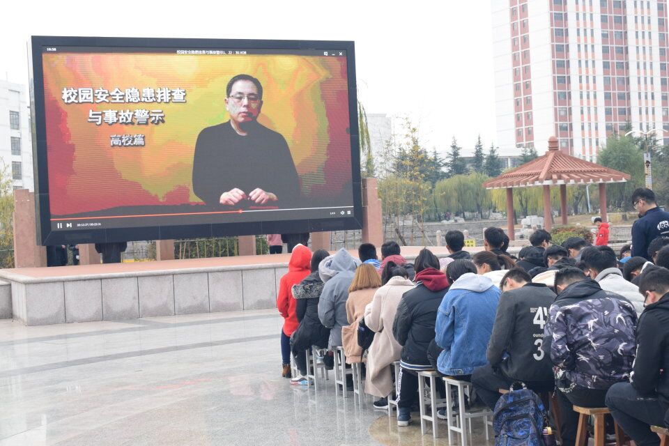 11月17日,太阳成集团tyc234cc在知音广场组织学生观看《校园安全隐患排查与事故警示(高校篇)》系列消防电影,学院18级学生参加。