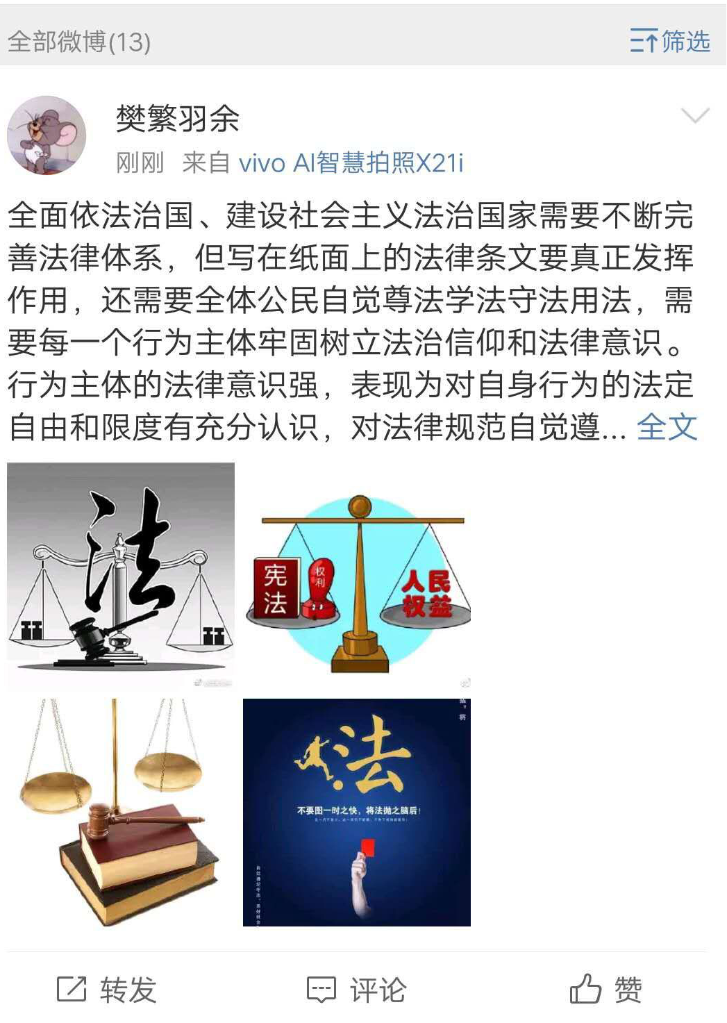 4月22日是世界法律日,为了让人们知法、懂法,学会用法律维护自己的权益,所以我院特举办“铭记法律保护自我”微博话题活动。世界法学家协会的宗旨是帮助创建“一个新的法治社会:强者面对公正、弱者得到保护、和平得以永续”。我院响应号召同学们加强法律意识。汉语言文学1801刘佳昕同学说到:“此次活动使我更加懂得法律的重要性,而且也让我知道国家法律越来越完备,现在我对国家法律充满了信心。”