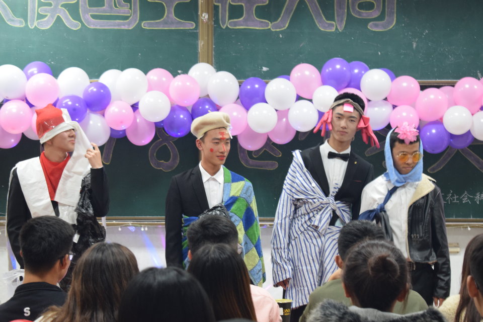 团队展示活动后,现场气氛逐渐调动起来,“这就是命”游戏将现场气氛推向高潮。每组选派一名男生,由同组成员挑选道具进行装扮,装扮后摆出pose活跃气氛。国王们身着特色搞怪服饰,在现场进行走秀,无所顾忌,逗得观众们前仰后合,纷纷给国王们拍照,上台为自己心中最酷的“新装”投票。游戏环节中展现出队员之间的温暖默契,模特们的走秀展现出人文学子的活力满满。