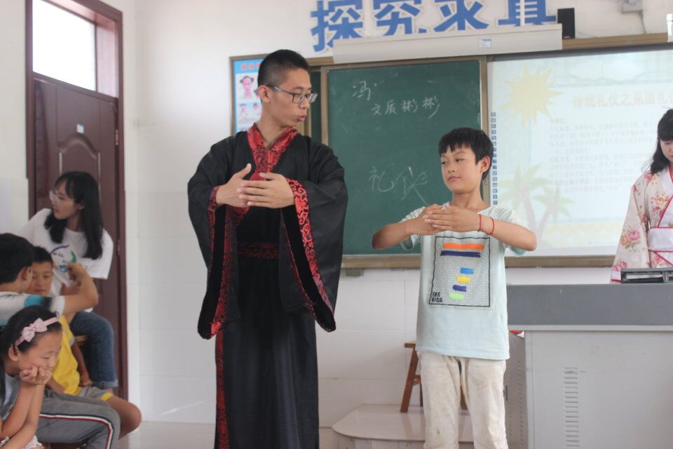服务团队员们结合学院特色与专业优势,经过前期一个多月的备课、试讲等准备工作,为乡村儿童打造出多类生动有趣的国学体验课堂,包括每日经典诵读、诗词竞赛、礼仪培训等课程,只为摒除乡村儿童对国学枯燥无味的偏见,使国学文化进一步传承与发扬。