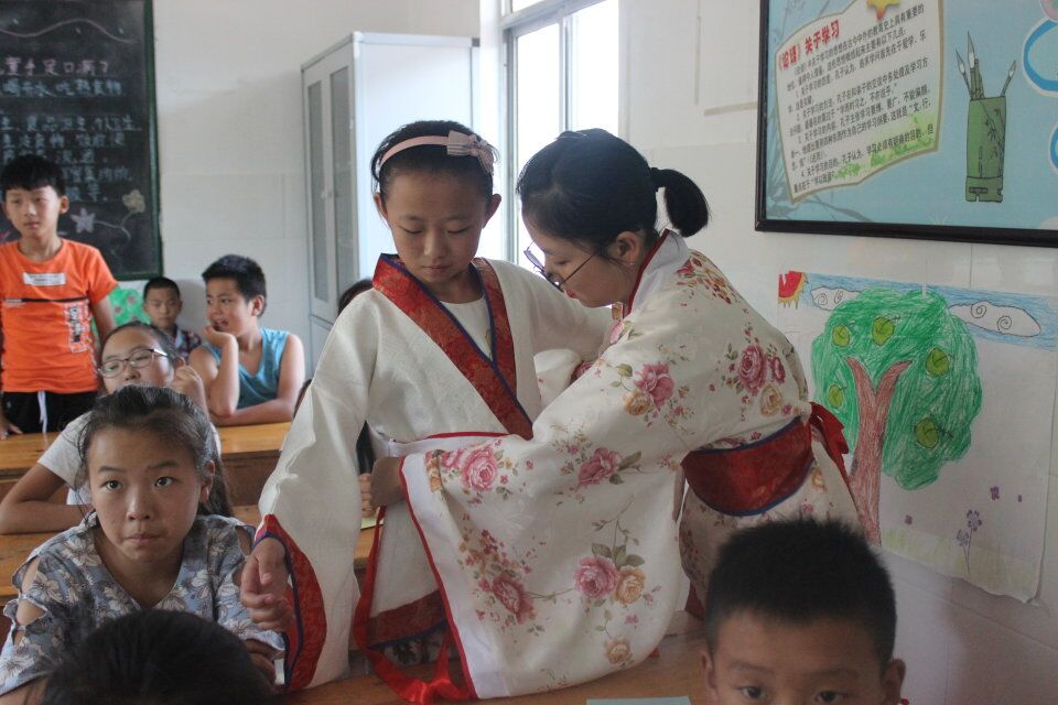“老师,你的古装是怎么穿的呀?”传统礼仪课上,孩子们积极向授课老师请教课堂问题。志愿者身着古装进行授课,创新课堂教学方式,用寓教于乐、丰富多彩的形式将孩子们完全引入传统礼仪文化的世界,通过讲述传统人物故事、演示传统礼仪操作,吸引了孩子的注意力,提高学习的效率与实效性。随后,队员们邀请孩子穿戴汉服、演示传统礼仪,让孩子们能够身临其境感受传统礼仪的魅力,实现国学文化的新传承。