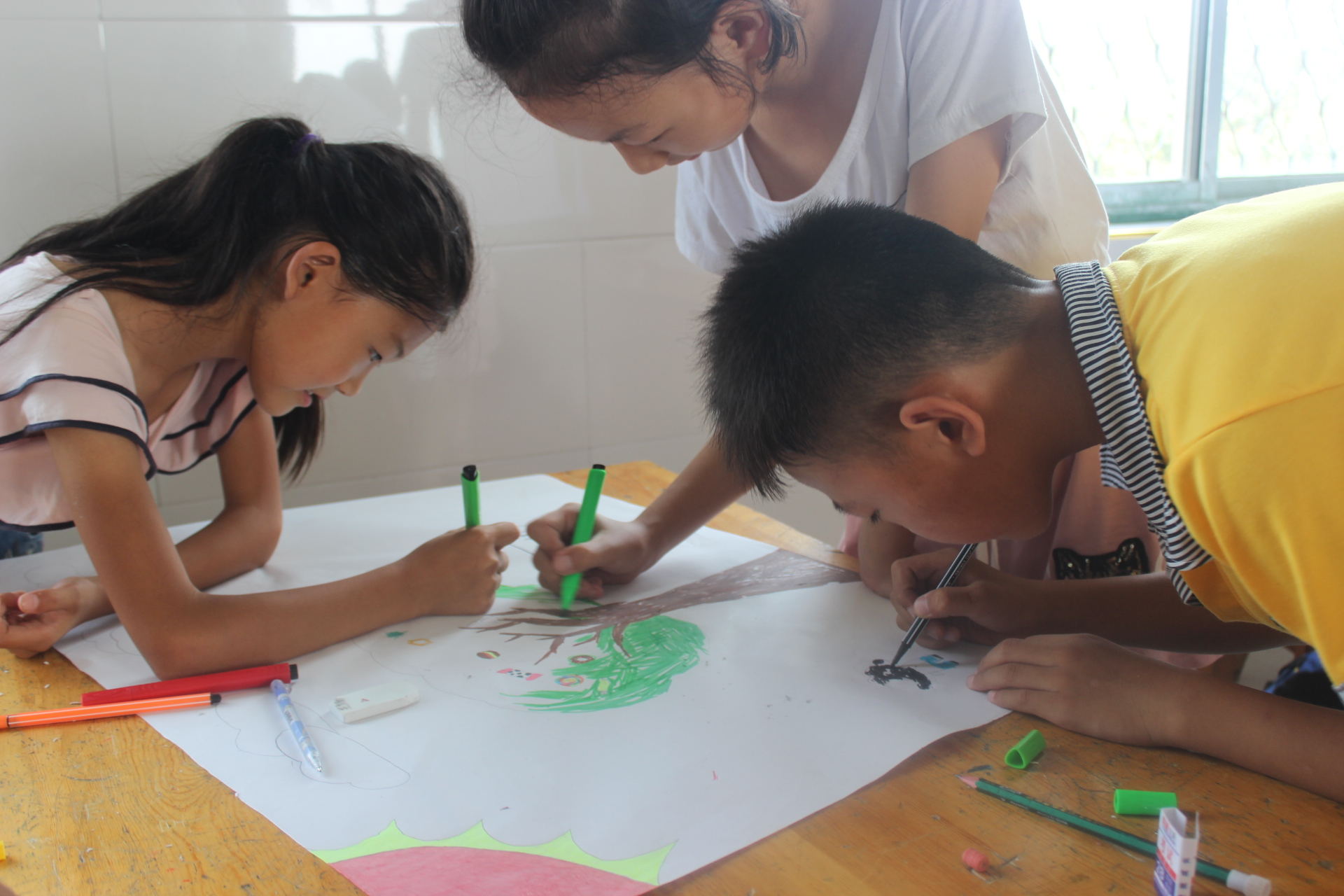 小朋友们在一起协作绘制魔法树。中国青年网通讯员 闫洁 摄
