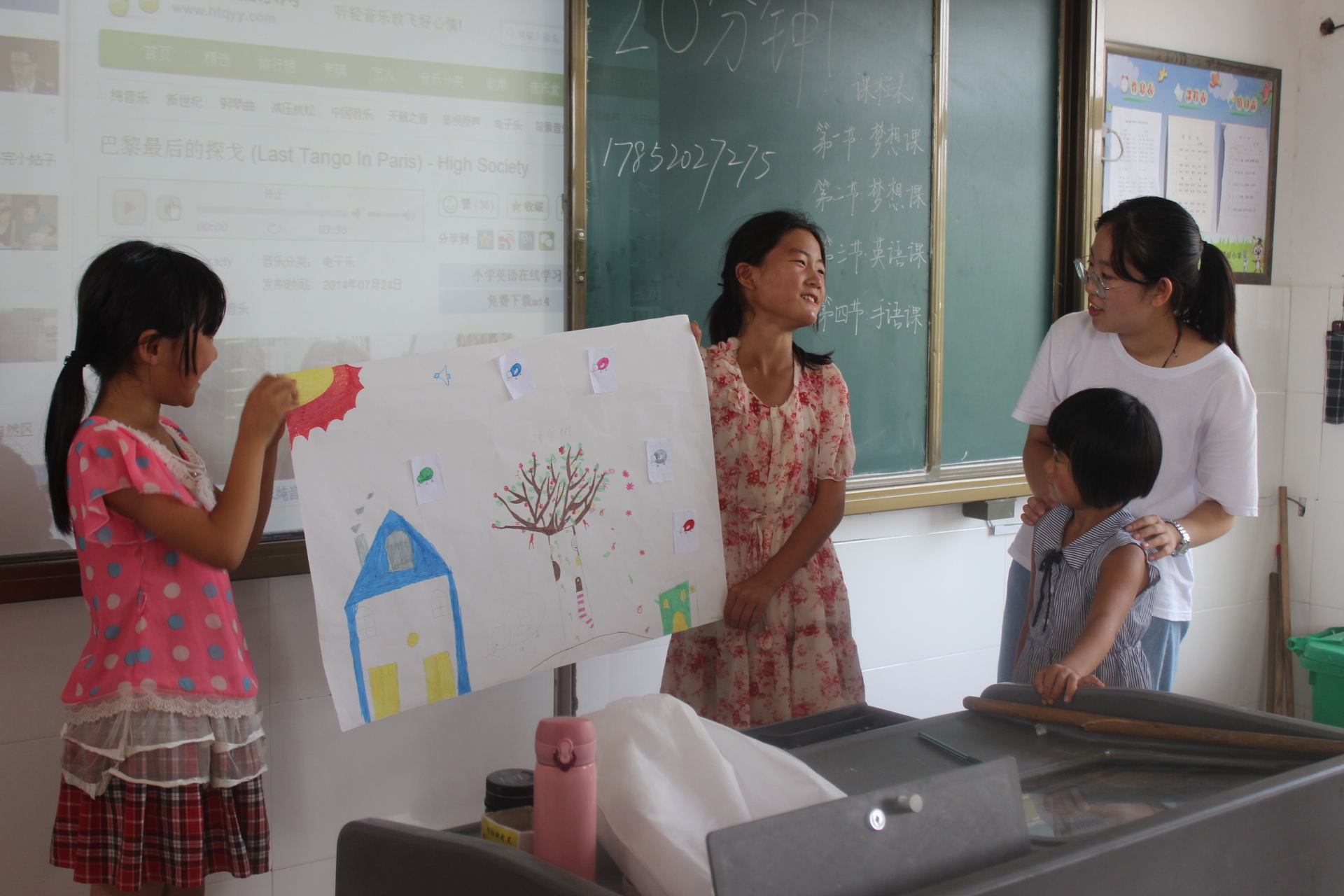 据两天的课堂教学和校长反映发现,部分乡村儿童性格比较内向,课堂参与度较低,不敢动手尝试,缺乏自信。针对这一现状,实践队员通过上海真爱梦想公益基金会为期两天的课程培训,新颖巧妙地设计梦想课程,综合绘本“魔法树”的四季律动,启发孩子们对梦想的向往和憧憬,运用小组合作学习,增强团队意识,加强孩子间的沟通协作能力。
