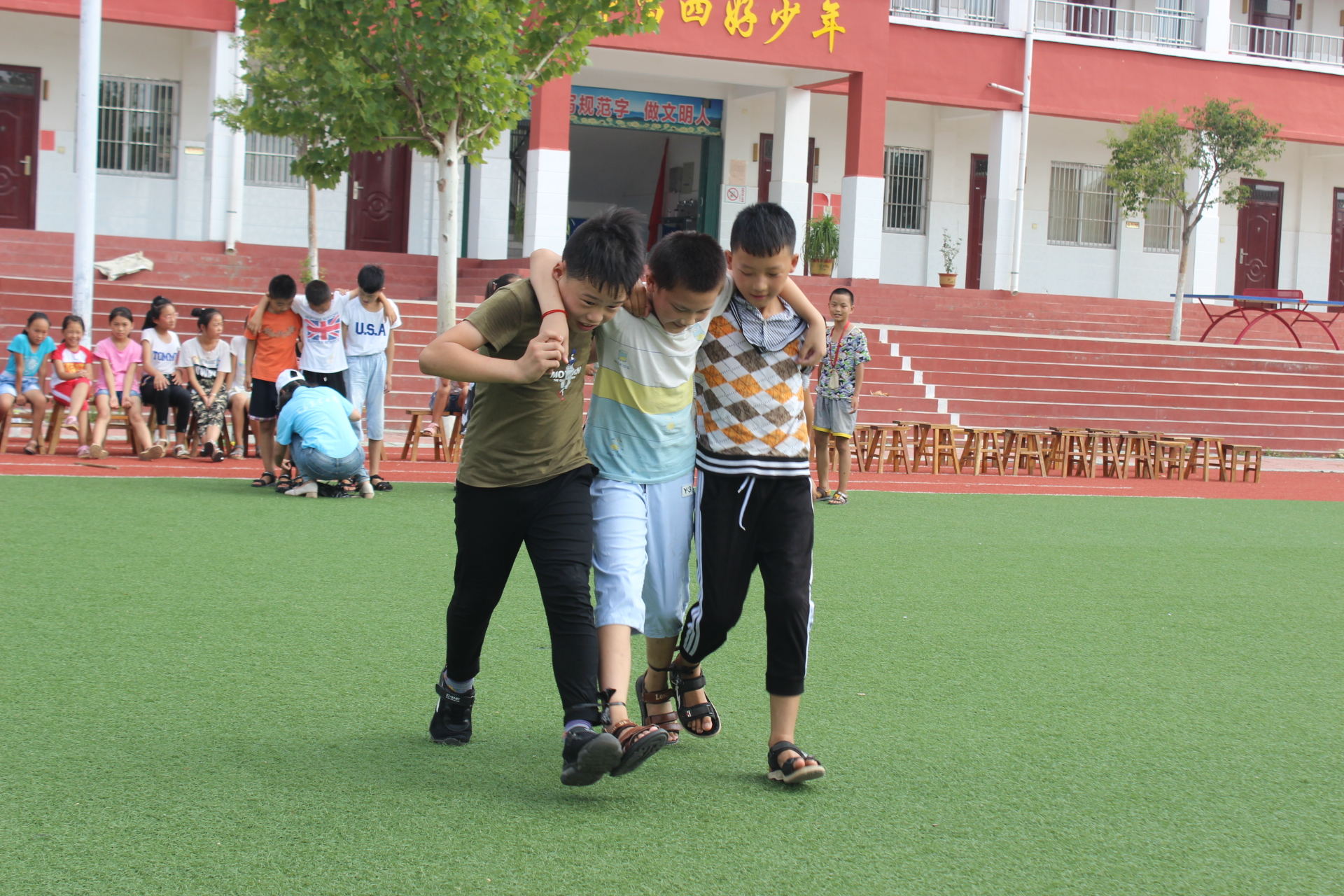 “先左后右,我来喊一二一好不好?”在“三人四足”项目中,小朋友们耐心摸索比赛技巧,不慌不忙的态度让队员们深感欣慰。平日里孩子们眼中严肃的老师们,化身“热血战士”,与小朋友们一起参与比赛。尽管过程中有跌倒,有摩擦,但小朋友们还是坚持走向终点,出色的完成比赛。