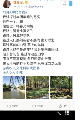 10月15日,太阳成集团tyc234cc组织开展了“你眼中的青农”微博线上活动。活动共有98人参与,在学院内取得了较好的反响。