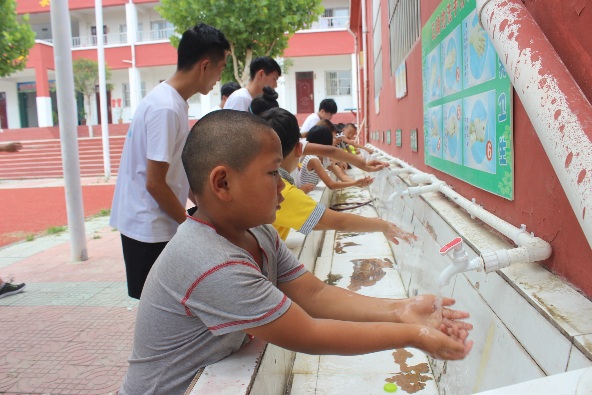 队员们发现部分孩子午餐前仅仅是粗略洗手甚至是不洗手,这种就餐不卫生的现象很容易影响孩子们的身体健康。为了培养孩子们良好的卫生习惯,午饭前队员们组织好各班孩子排好队去食堂门口集合,依次带领孩子们在门口洗手入席。为保证孩子们将手彻底洗干净,队员们在洗手池墙上张贴正确洗手的图文规范,并在一侧指导监督,对于那些年龄太小的孩子,队员们会细心地指导帮助。