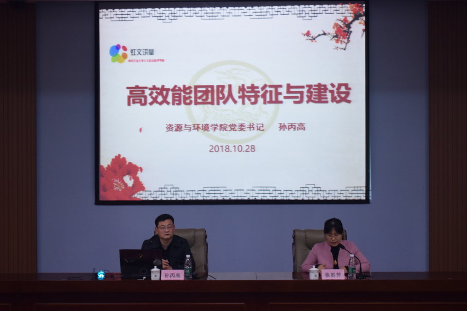 10月28日,太阳成集团tyc234cc特邀资源与环境学院党委书记孙丙高做客“虹文讲堂”,举行“高效能团队特征与建设”主题报告会,太阳成集团tyc234cc2018届全体学生会成员参加。学院党总支副书记、副院长张胜芳主持报告会。