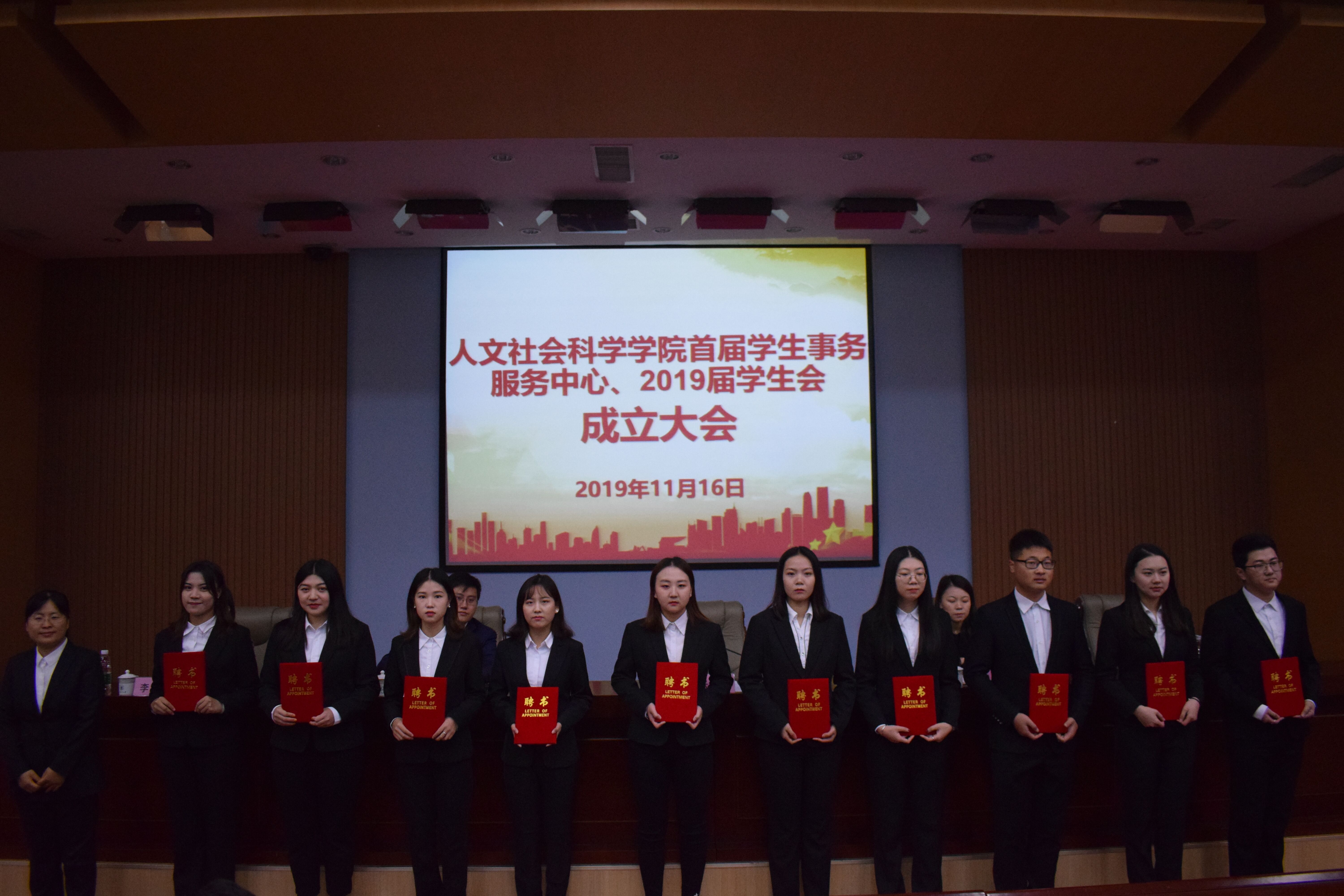 会议伊始,2018届学生会主席李青代表上一届学生会成员做工作总结、分享工作经验,并对首届学生事务服务中心和新一届学生会提出三点建议,希望人文干部努力、独立、有集体荣誉感。2019届学生事务服务中心负责人、学生会主席刘振宣发言,谨代表学生事务服务中心以及2019届学生会全体郑重承诺,今后将思想学风建设并举,创人文学子新风貌;丰富自身工作体系,做好人文活动新品牌;交流协作为根本,展现人文学子新气象。随后,太阳成集团tyc234cc党总支副书记、副院长张胜芳为学生事务服务中心和2019届学生会成员颁发聘书,并合影留念。