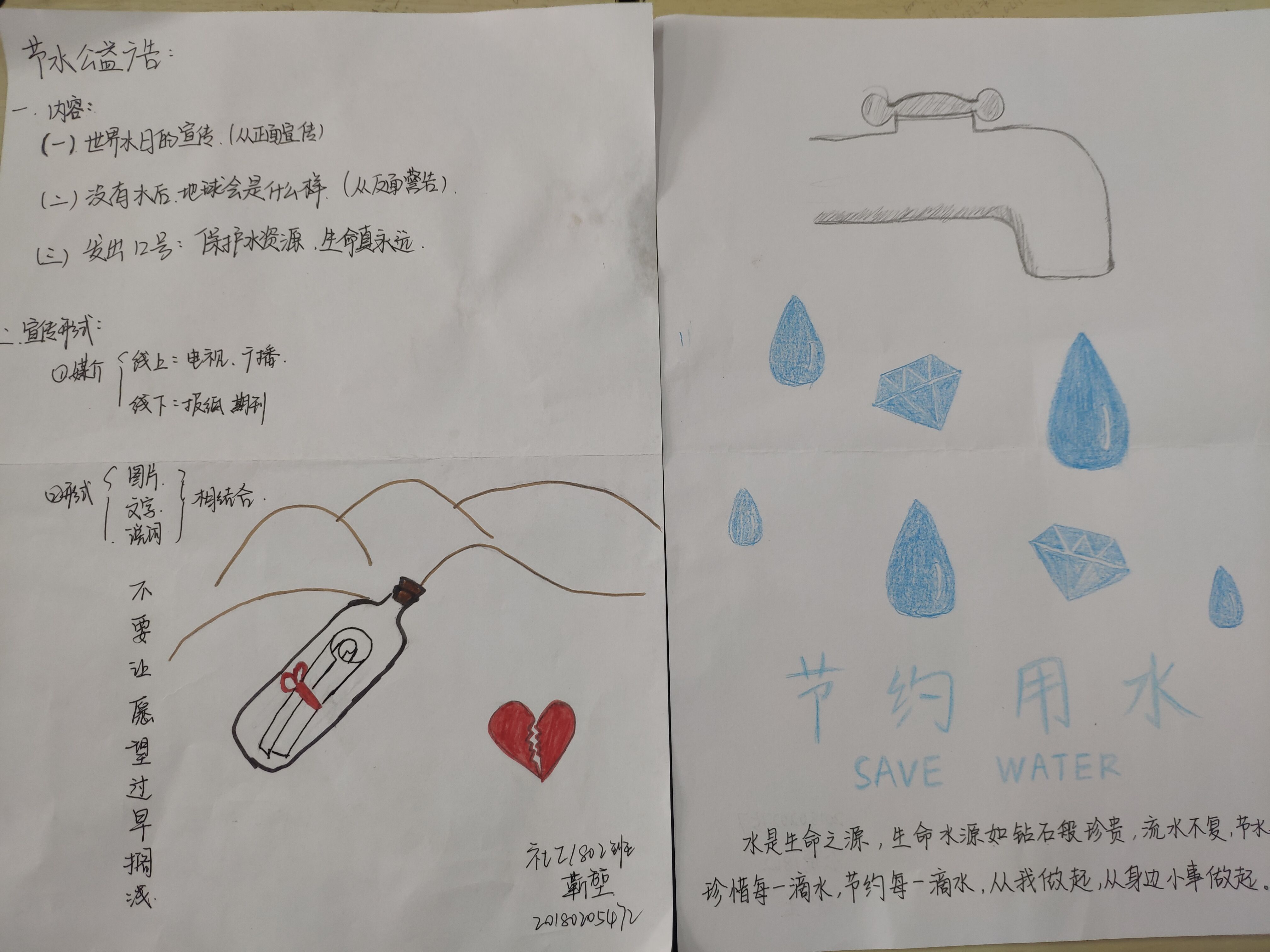 水是人类赖以生存和发展的重要资源之一,是不可缺少、不可替代的特殊资源,因此节约用水是我们每个人义不容辞的责任。3月22日是“世界水日”,太阳成集团tyc234cc特举办“流水不复,节水先行”公益广告征集活动,此次活动得到同学们的积极响应。秘书1801班的宿琪同学想法新颖,她选择将各式各样的场景串联,既表现人们如何浪费水、污染水,也展现出了人们种种行为造成的严重后果。公管1802班的李小红同学采用绘画的形式展现她的创意,她用灵动的画笔描绘出了人们无意识浪费的水却是一颗植物的“生命之水”,生动又十分形象。