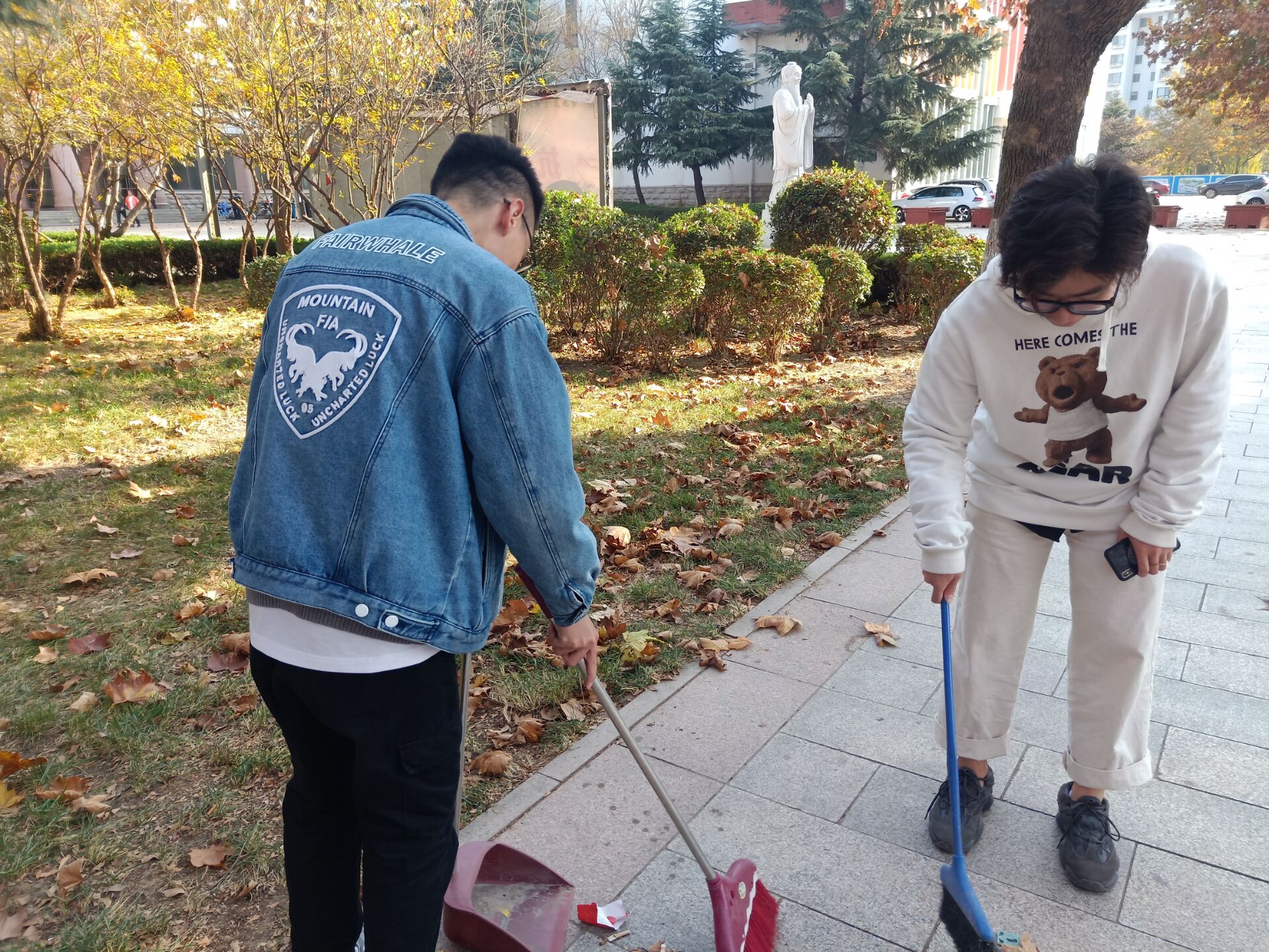 此次清洁主要围绕文经楼与学术会馆区域进行打扫,将烟头、果皮等垃圾作为打扫重点。各部门积极踊跃参加,同学们团结协作、分工明确、不惧苦累,仔细清扫,保证卫生区整洁、干净。落叶及垃圾的收拢、装袋井然有序,做到经过一处,洁净一处,不留死角。经过一天的打扫,校园环境换旧貌展新颜。
