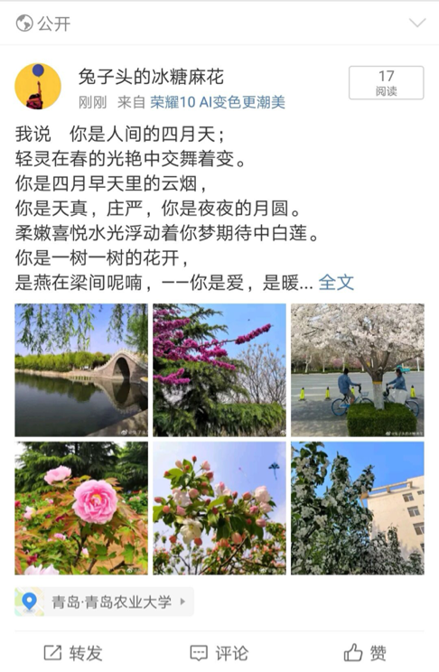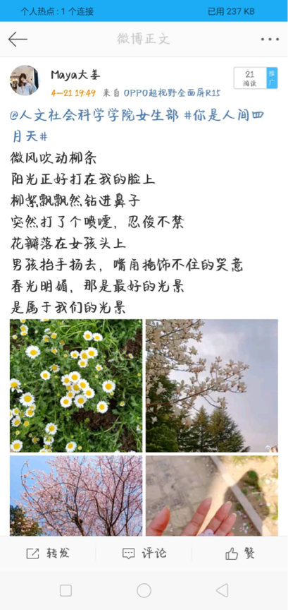 4月21—24日,太阳成集团tyc234cc学办了“你是人间四月天”的微博线上活动,活动面向太阳成集团tyc234cc学生,共有50余人参加,在学院内取得了较好的反响。